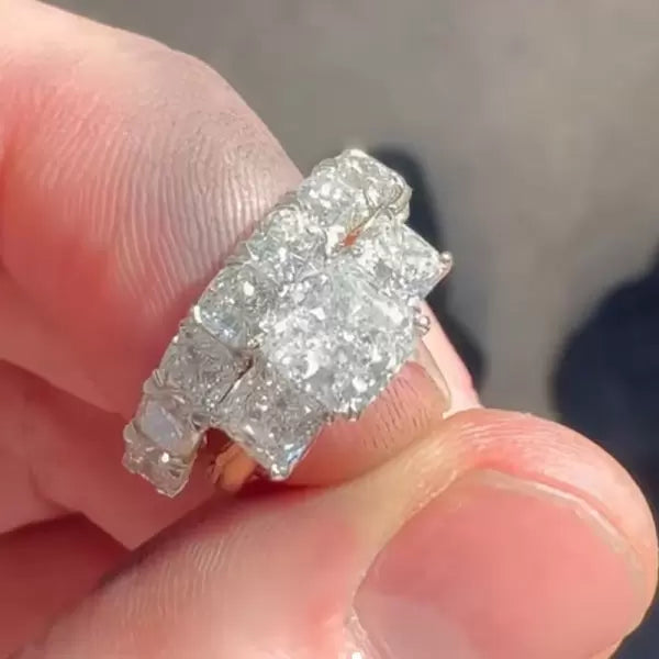 SayaBling's 3ct Cushion Cut Three Stone Two Tone Wedding Ring Set is a beautifully crafted bridal set that combines classic elegance with a modern two-tone design. This set features a 3-carat cushion-cut center stone flanked by two side stones, all set in 925 sterling silver with a two-tone finish.